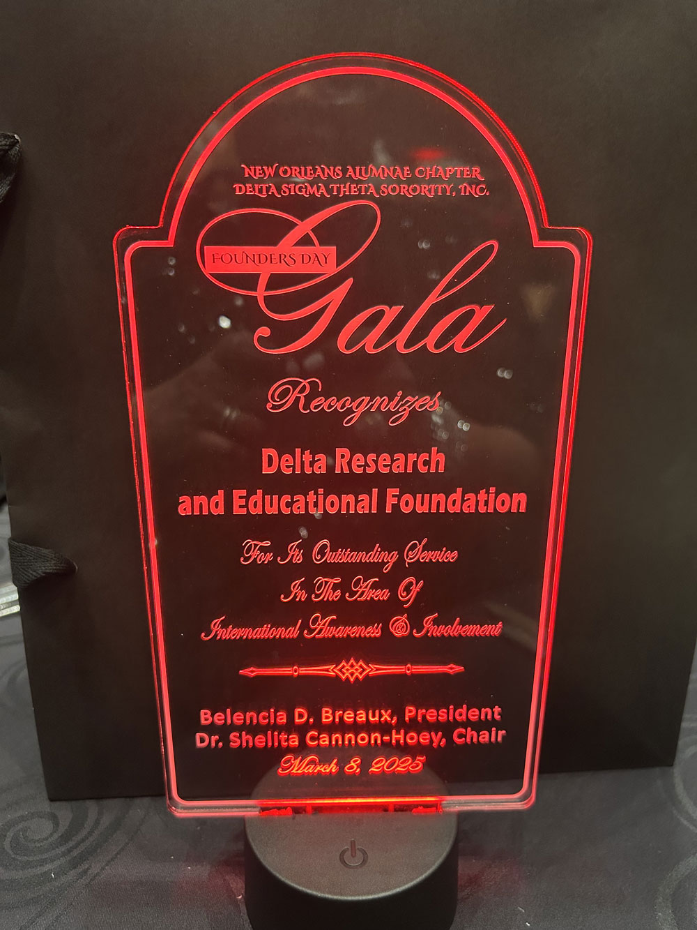 On Saturday, March 8, 2025, Delta Research and Educational Foundation was honored for its work as a community partner in the area of International Awareness & Involvement during the Founders Day Gala hosted by New Orleans Alumnae Chapter, Delta Sigma Theta Sorority, Incorporated.