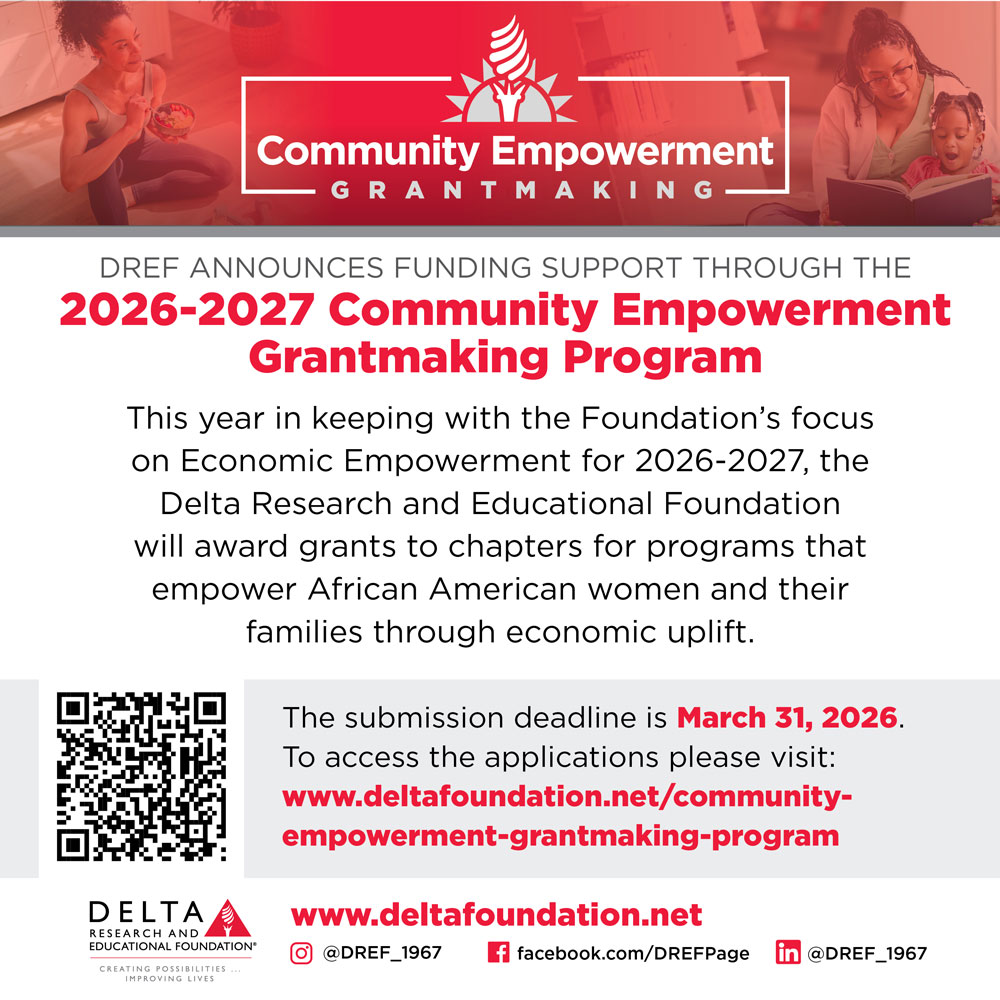This year in keeping with the Foundation’s focus on Economic Empowerment for 2026-2027, the Delta Research and Educational Foundation will award grants to chapters for programs that empower African American women and their families through economic uplift.
