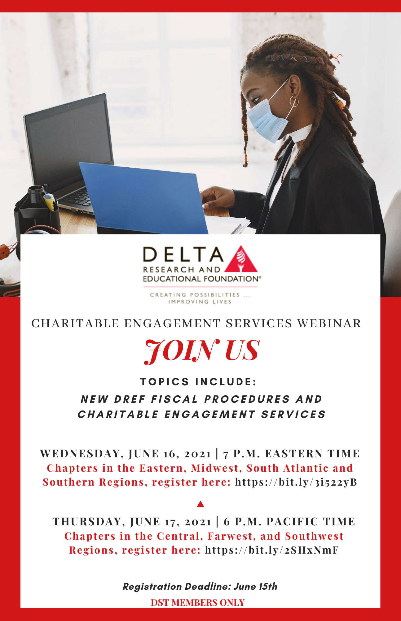 The Delta Research and Educational Foundation (DREF) continues to support DST Chapters through Charitable Engagement Service (CES) as it presents two informational webinars. The webinars will be held on Wednesday, June 16, 2021 at 7:00 p.m. (Eastern Time) and on Thursday, June 17, 2020 at 6:00 p.m. (Pacific Time). The same workshop will be held on both dates.